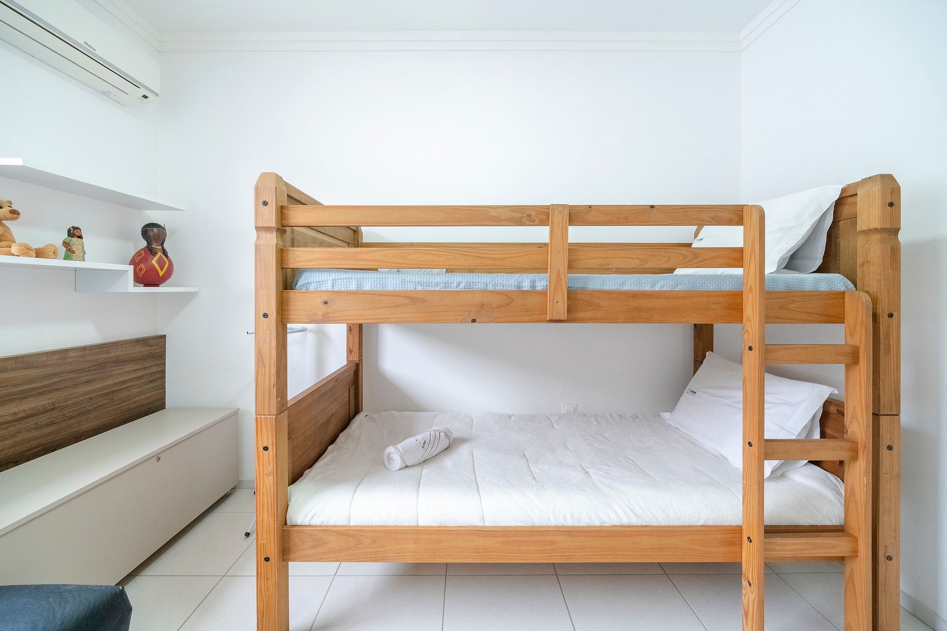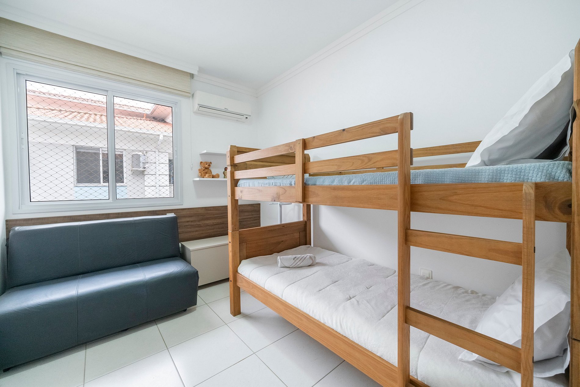 O apartamento Lúmen conta com dois quartos muito confortáveis: uma suíte com cama queen e um segundo quarto com beliche.