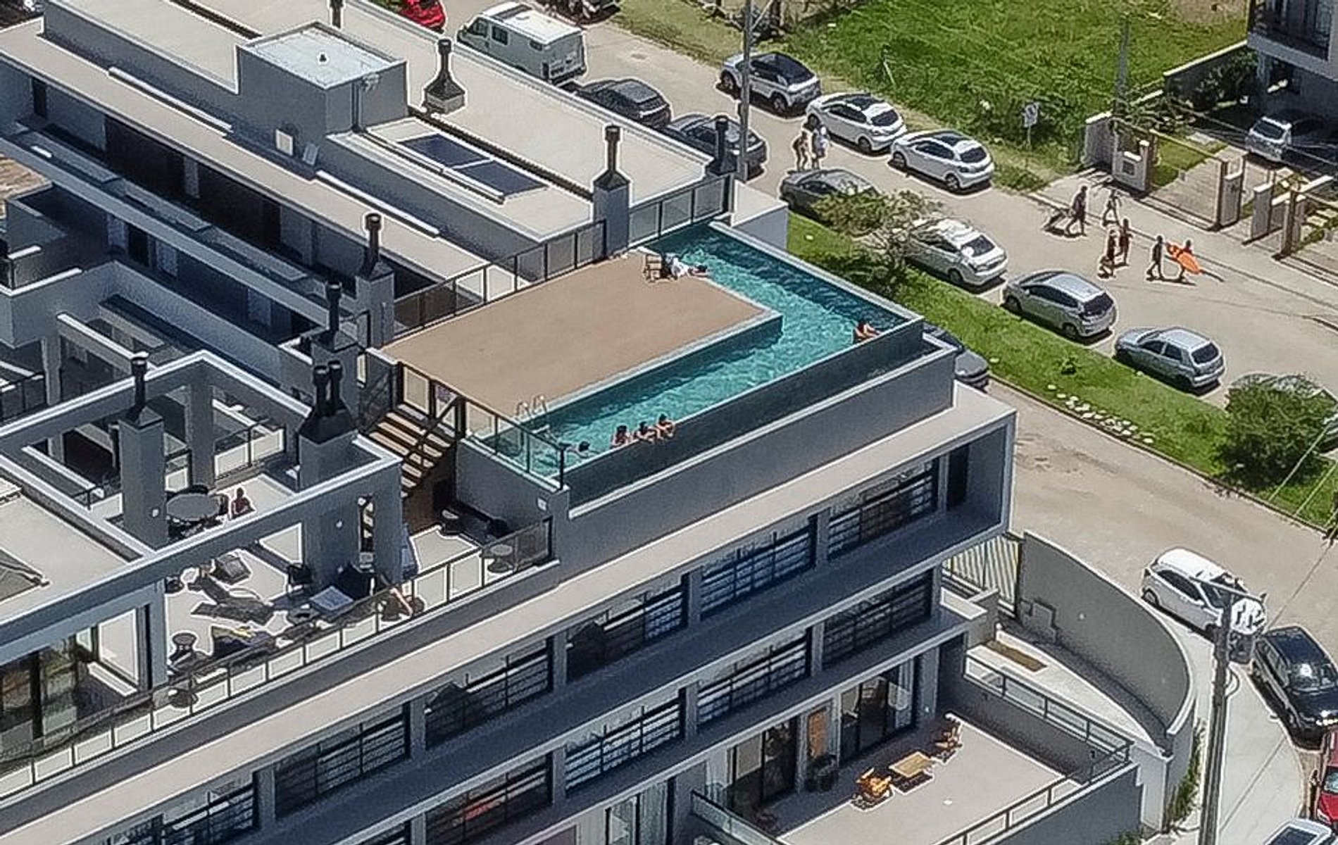 O condomínio oferece uma piscina espetacular com vista para o mar e está próximo a mercados e toda a conveniência da Barra da Lagoa.