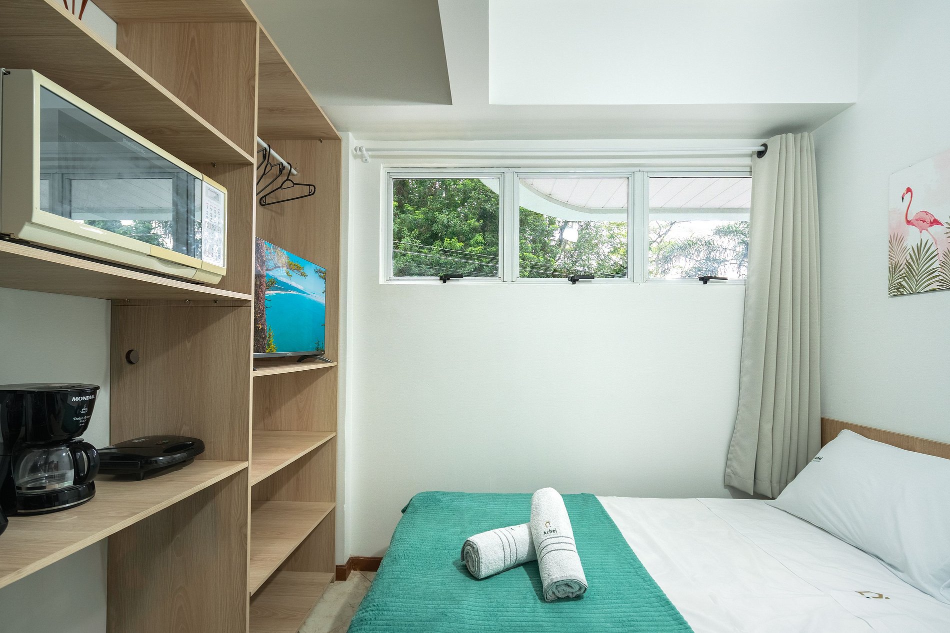 O Estúdio First possui uma cama de casal, Smart TV, liquidificador, microondas, cafeteira, sanduicheira e itens básicos de cozinha, além de estacionamento gratuito com uma vaga de garagem e internet Wi-Fi.